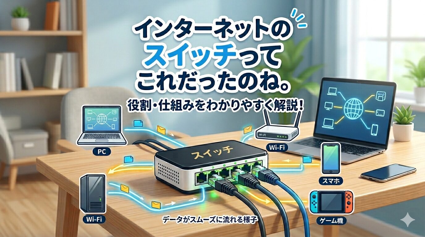 Wi-Fiは無線でつなぐ仕組みで、スイッチは機器どうしをネットワークにつなぐための機器、と考えるとイメージしやすいです。